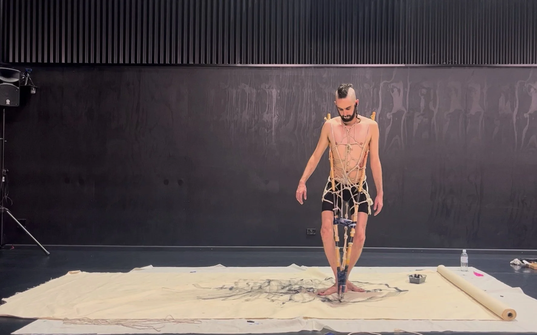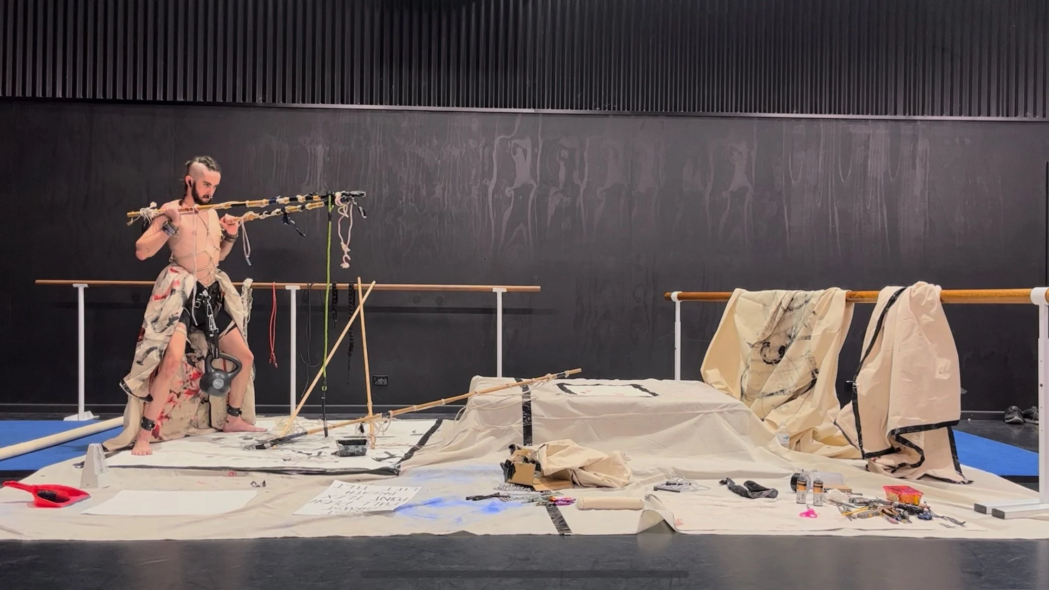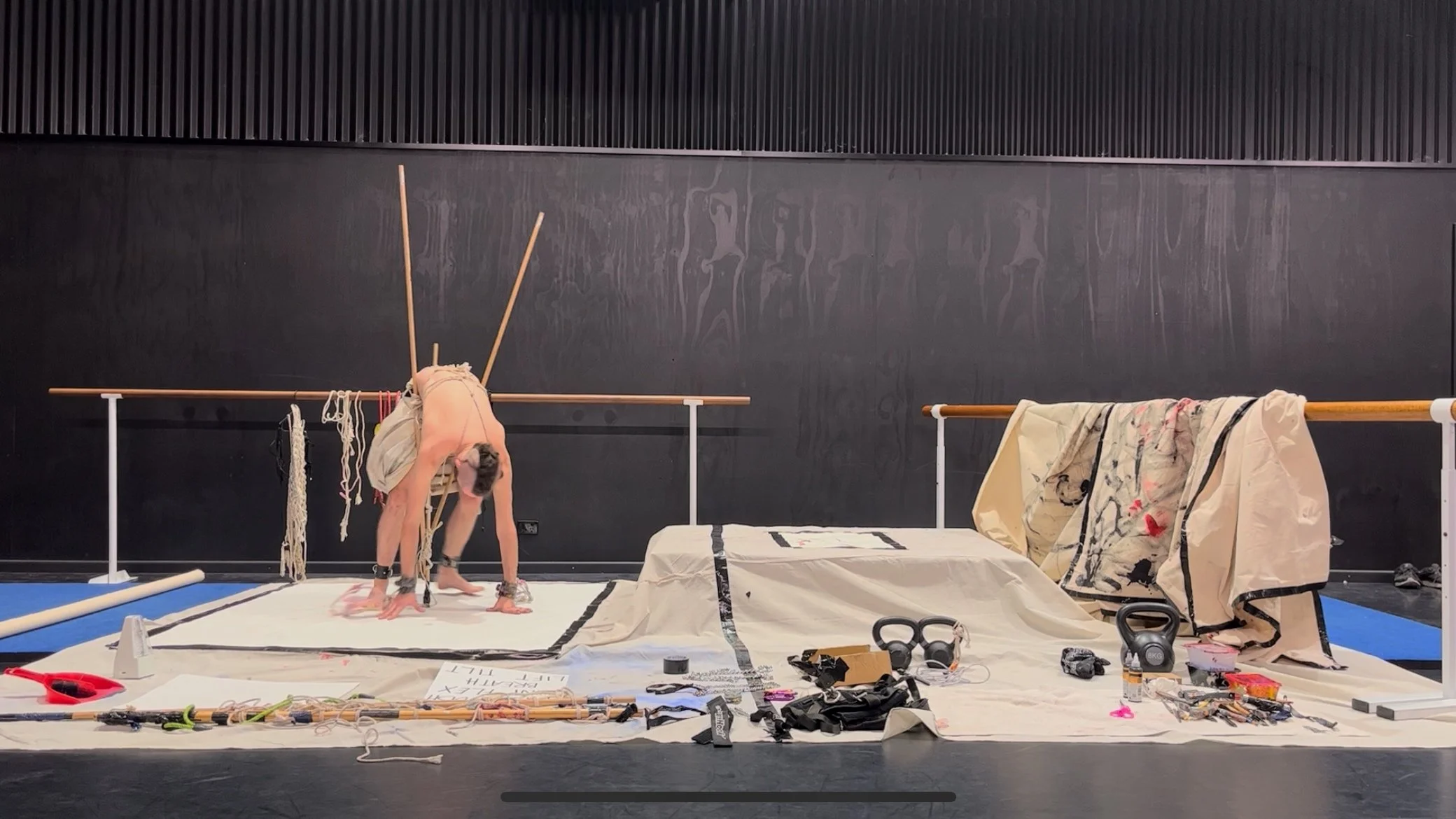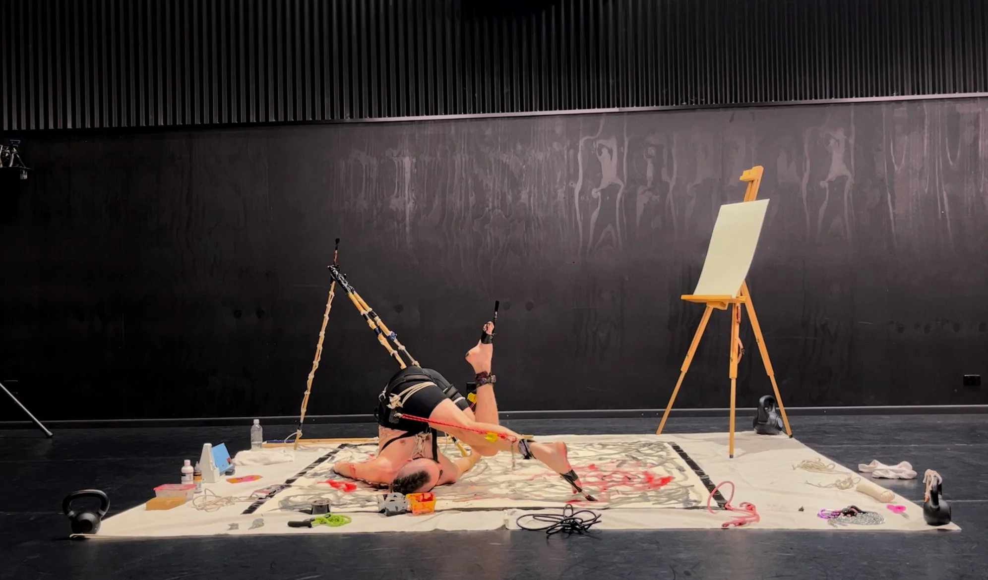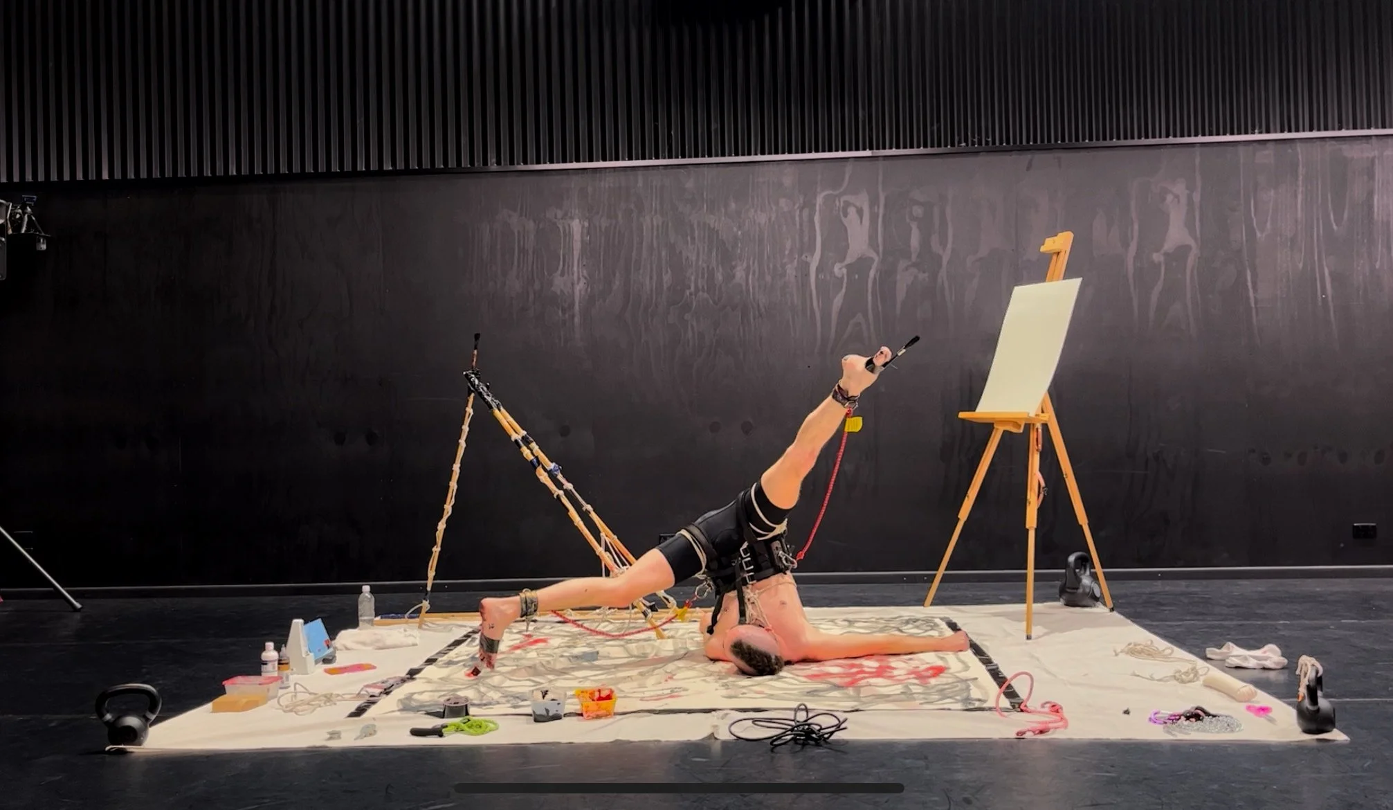 A Body Which Draws Itself is an ongoing, iterative project exploring the body’s capacity for recording an image of itself. Utilising bondage, predicament and counterweights, Micah attempts to place the body into a situation in which the reflexes, movements and intuitive travel through space make marks that record the body’s experience. By placing the body in these states, Micah is exploring whether their focussing on motor functions in predicament scenarios can allow a flow-state to emerge, encouraging organic mark making and placing a limit on conscious, aesthetic decisions in the artwork created.