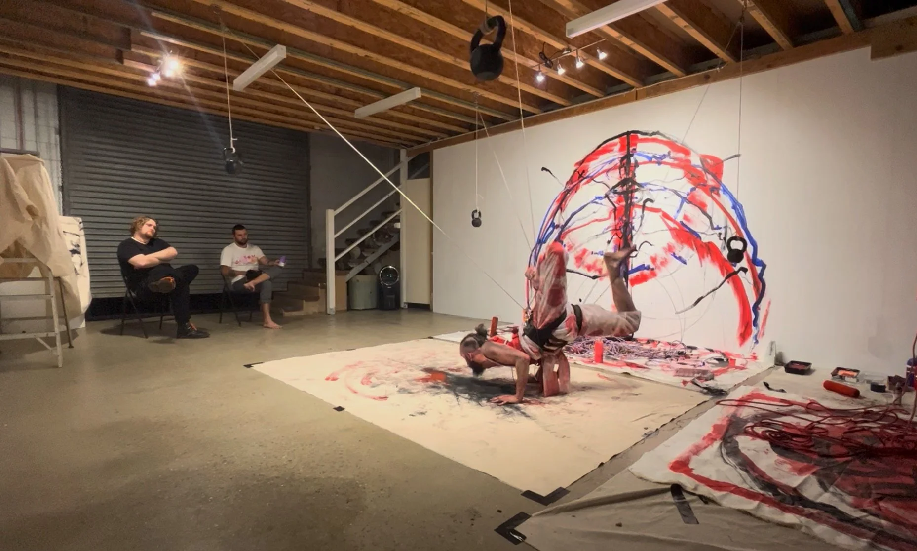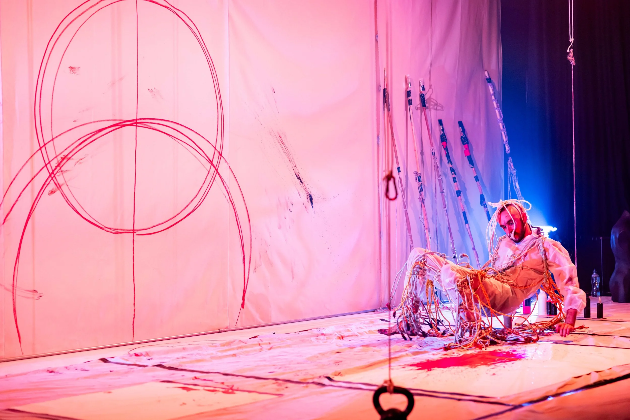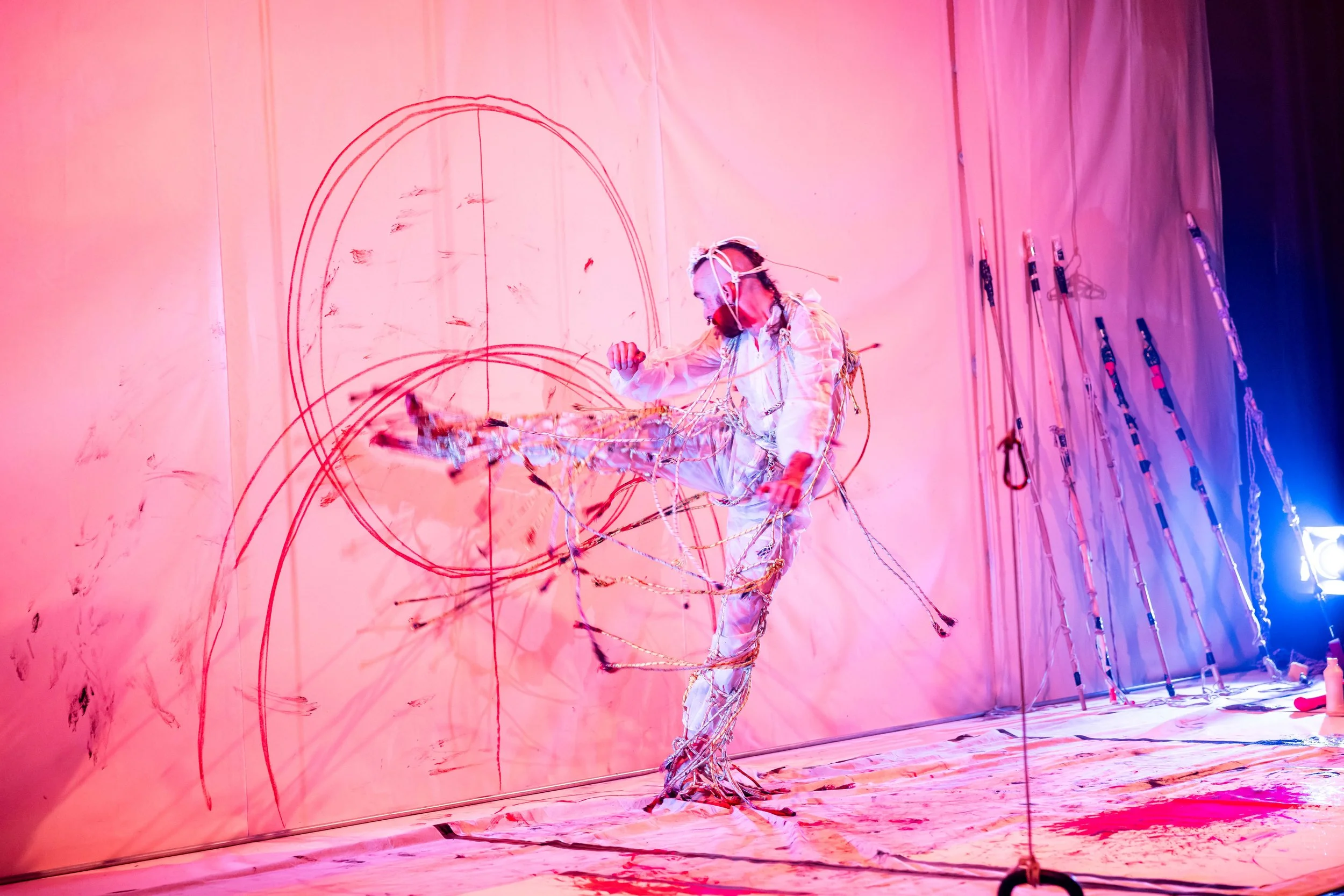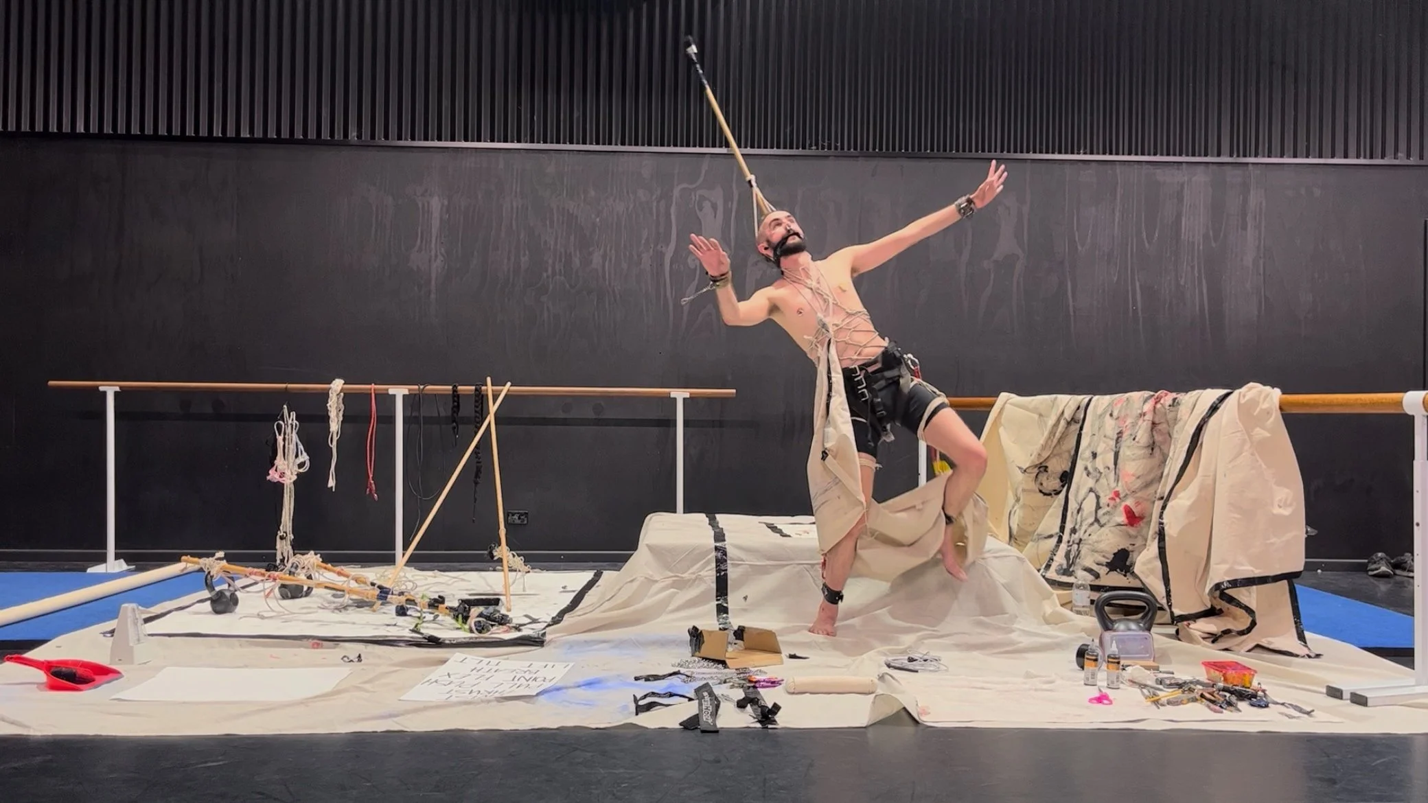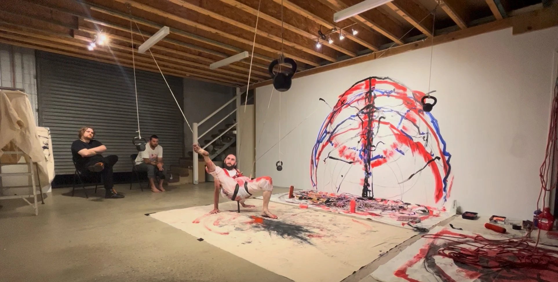 A Body Which Draws Itself is an ongoing, iterative project exploring the body’s capacity for recording an image of itself. Utilising bondage, predicament and counterweights, Micah attempts to place the body into a situation in which the reflexes, movements and intuitive travel through space make marks that record the body’s experience. By placing the body in these states, Micah is exploring whether their focussing on motor functions in predicament scenarios can allow a flow-state to emerge, encouraging organic mark making and placing a limit on conscious, aesthetic decisions in the artwork created.